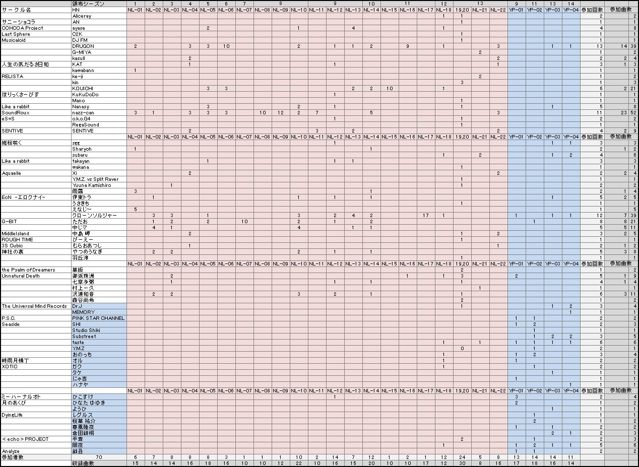 ということでアレンジャーさんの参加状況を表にまとめてみました。
